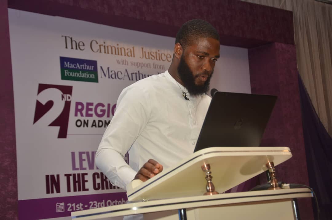 Ifeanyi delivering a presentation at the 2nd Regional Conference on Administration of Criminal Justice, themed "Leveraging Technology in the Criminal Justice System." The conference was held at the Abuja Continental Hotel from 21st to 23rd October, 2024.